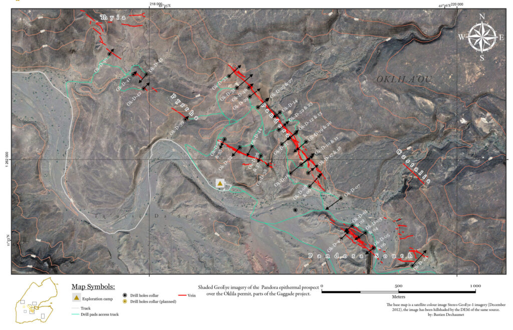 The 93 sq km Oklila licence includes the main Pandora epithermal vein target (comprising Pandora and Pandora South prospects) which is up to 15 metres wide at surface and can be traced over a strike length of approximately 2 km. Grades vary from 5ppb Au to 54.5g/t Au.