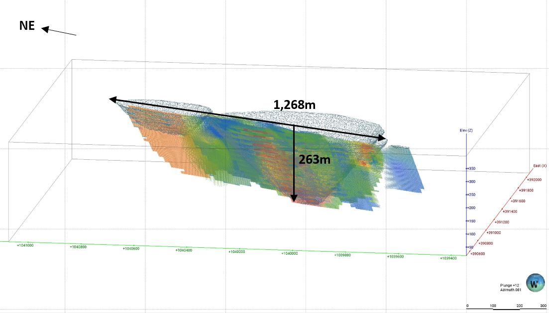 Updated 3D Isometric view of the Resource blocks within U$2,000/oz pit shell, looking east