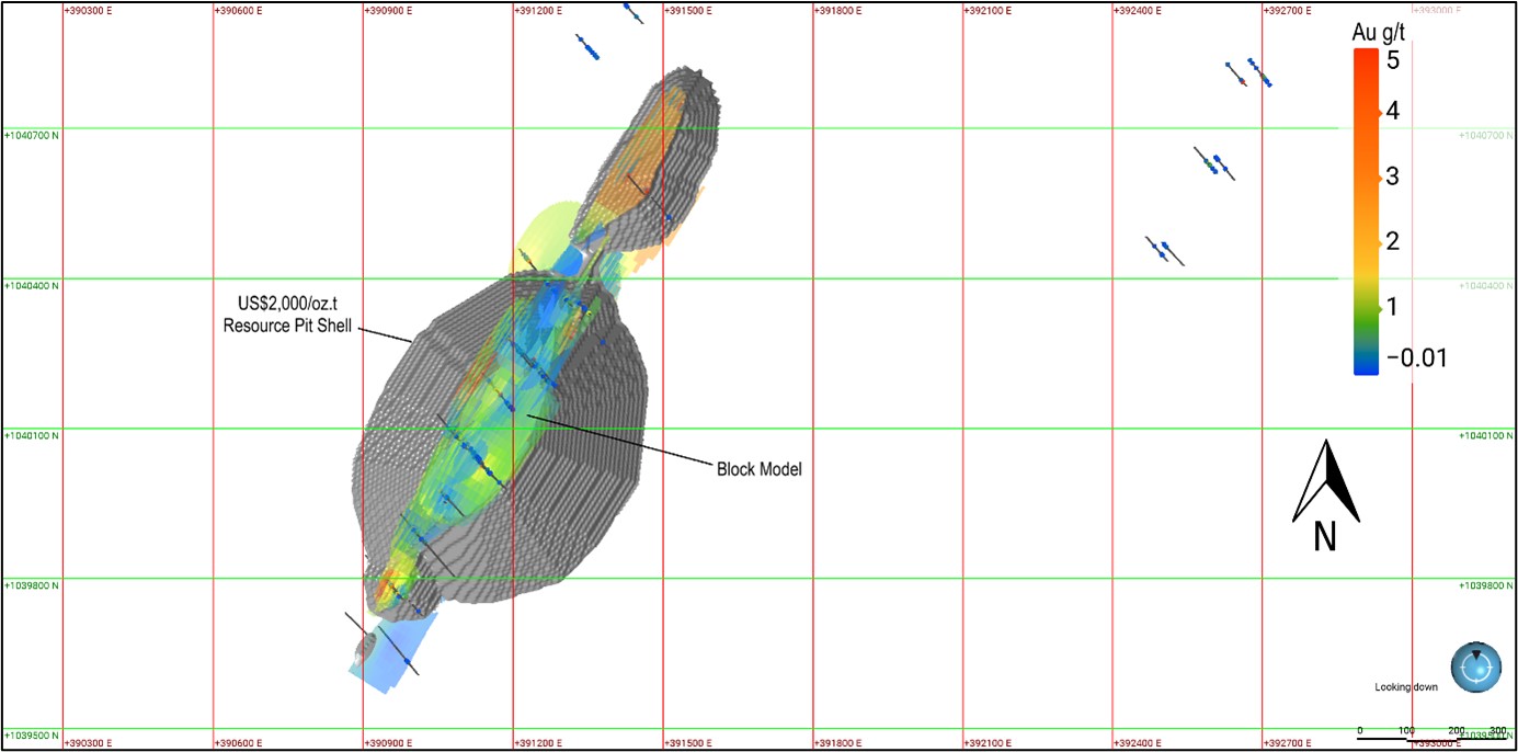Plan view showing the block model with U$2,000/oz Resource pit shell, and drill holes used to estimate the Bakassi Zone 1