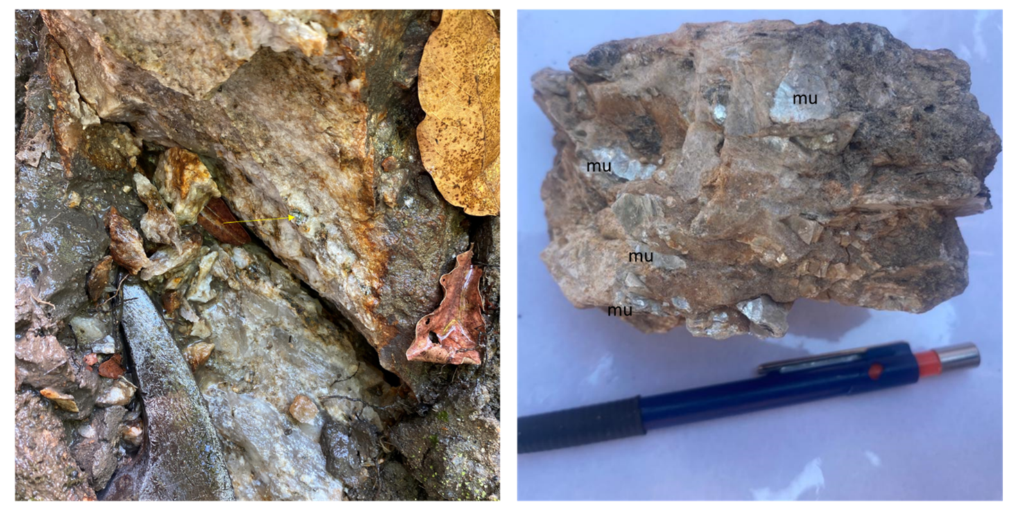 Pegmatite variation at Ndom: Sheared pegmatites (left) and a pegmatite grab sample with centimetre scale muscovite micas